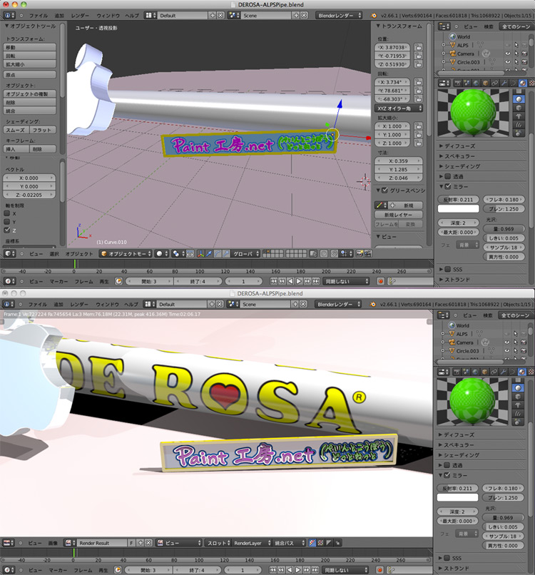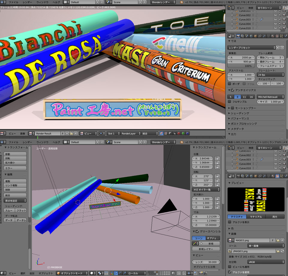 画像の上がレンダリングした時の画像で下側は各オブジェクトの位置や設定を行う画面となります。